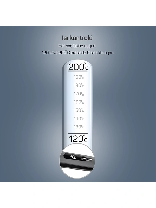 Her saç tipine uygun sıcaklık ayarı (120°C - 200°C) ile saçınız için en uygun sıcaklığı seçebilirsiniz. 200°C profesyonel sıcaklık ayarı sayesinde saçınızı kolayca şekillendirebilir ve ideal görünümü kolaylıkla elde edebilirsiniz.