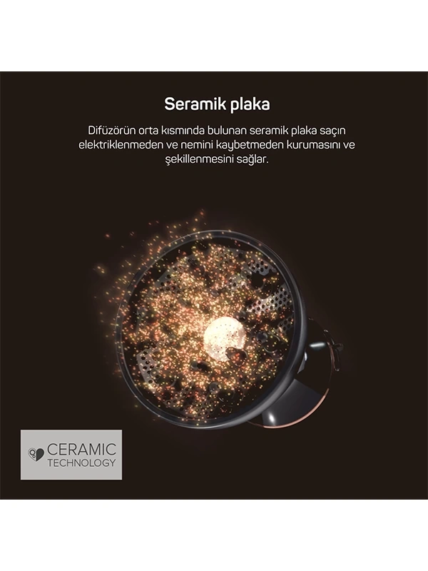 Difüzörün orta kısmında bulunan seramik plaka saçın elektriklenmeden ve nemini kaybetmeden kurumasını ve şekillenmesini sağlar.