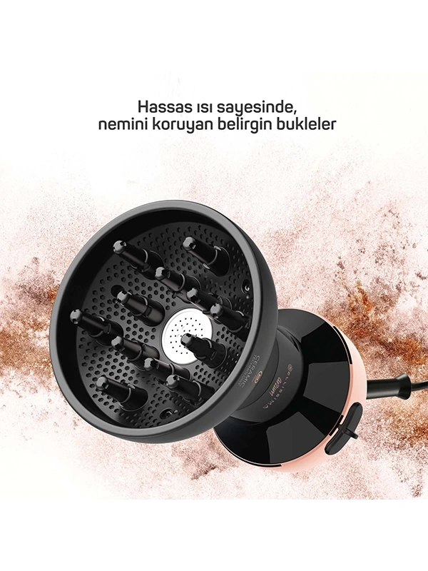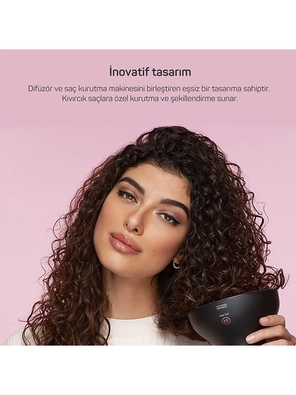 Difüzör ve saç kurutma makinesini birleştiren eşsiz bir tasarıma sahiptir. Kıvırcık saçlara özel kurutma ve şekillendirme sunar.